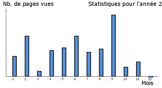 // on définit un tableau contenant le nombre de page vues par mois : par exemple, on suppose que 1500 pages du site ont été vues en janvier, 2450 en février, etc... Bien sur, pour que ce script soit vraiment valides, vous n'allez pas déclarer ce tableau, car sinon, les bâtons seront toujours les mêmes :) Vous allez plutôt effectuer une requête SQL sur votre base de données permettant de récupérer le nombre de pages vues de votre site par mois. Ensuite, il suffira d'appeler le script avec ces 12 paramètres dans votre page html